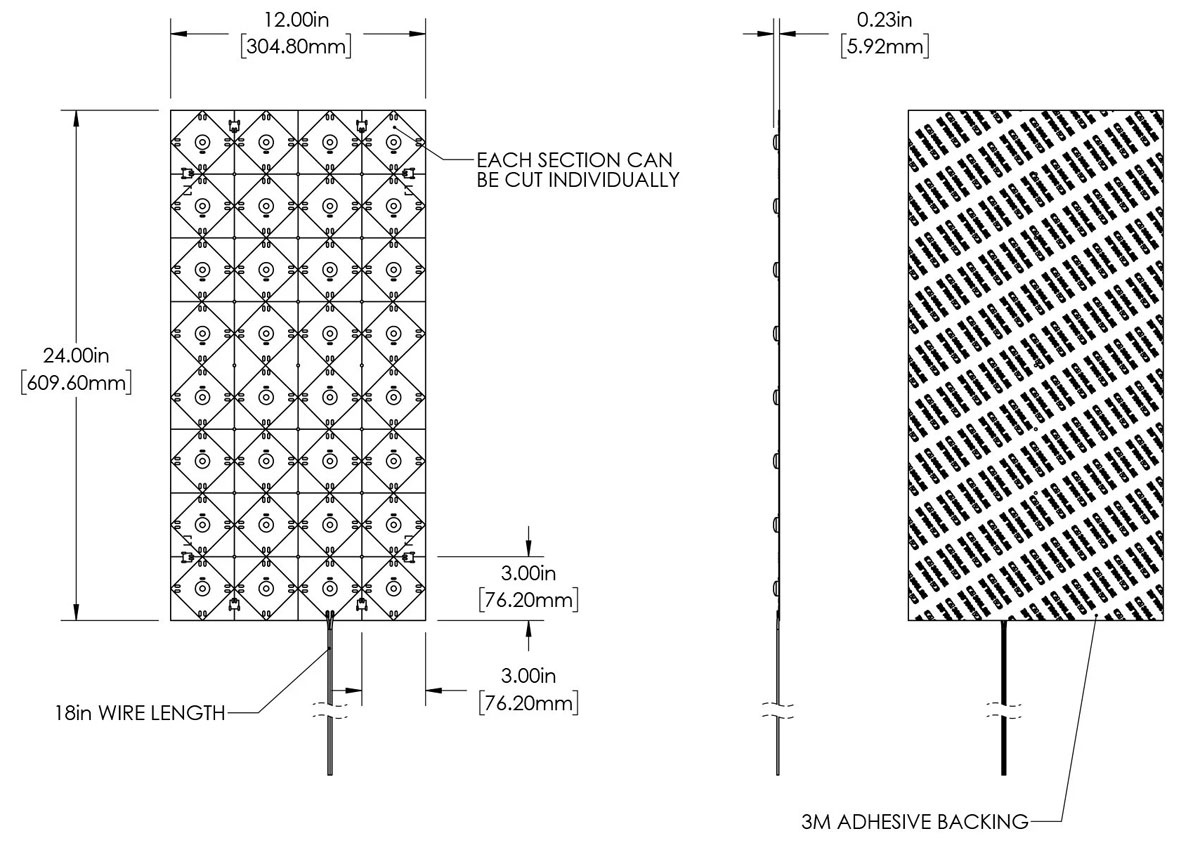 The LLS Series Flexible LED Light Sheet is designed for precision lighting applications. It offers versatility for channel letters, displays, and sign lighting. Its cuttable design adapts to unique shapes and wraps corners seamlessly, ensuring compatibility with various installations. Its 180° optic lenses provide uniform light distribution without hot spots, even when mounted as close as 1.18 inches from the diffuser. Each 24” x 12” sheet is divided into 32 segments, each measuring 3” x 3” and containing a single high-output LED. The sheet is available in warm (3000K), natural (4000K), or cool white (5000K) color temperatures. For secure installation, use the integrated 3M™ adhesive backing or screw mounting points indicated on the sheet.
