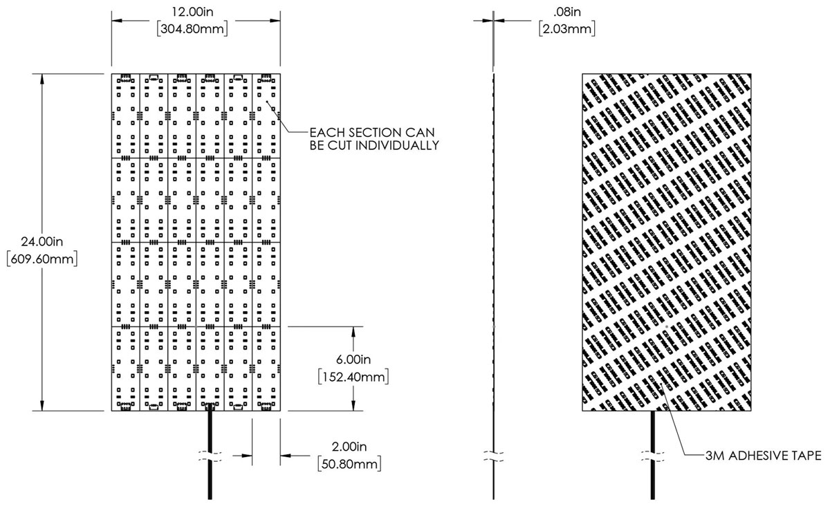 The LLS Series Flexible RGB LED Light Sheet is a versatile solution for creating unique lighting displays in channel letters, displays, and sign lighting. Featuring 288 high-density LEDs per sheet, it delivers smooth, vibrant illumination. Each 24” x 12” flexible sheet is divided into 24 segments, each measuring 6” x 2” and containing 12 LEDs, offering RGB color-changing and dimming capabilities. The light sheet can be tailored to fit irregular shapes and wrap around corners for seamless integration. Installation is made easy with a 3M™ adhesive backing or screw mounting at designated points for secure placement.