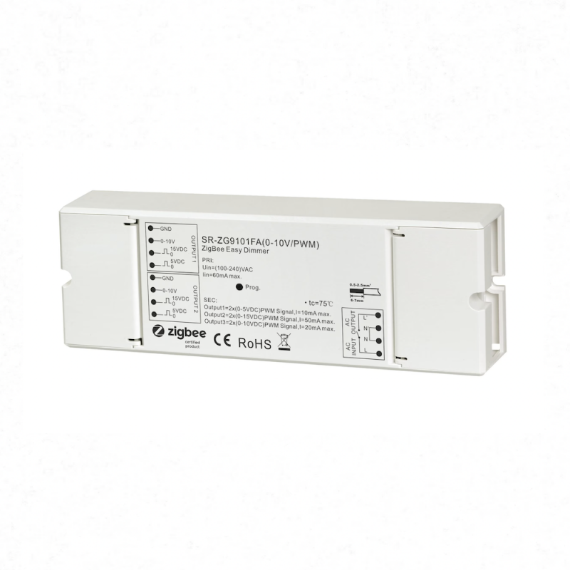 Sunricher SR-ZG9101FA-DIM (0-10V/PWM) is a ZigBee 3.0 controller designed to control 0-10 V or PWM compatible lighting fixtures and equipment. It allows for easy integration of professional lighting solutions into a ZigBee home automation system, while ensuring precise and reliable control of light intensity.
